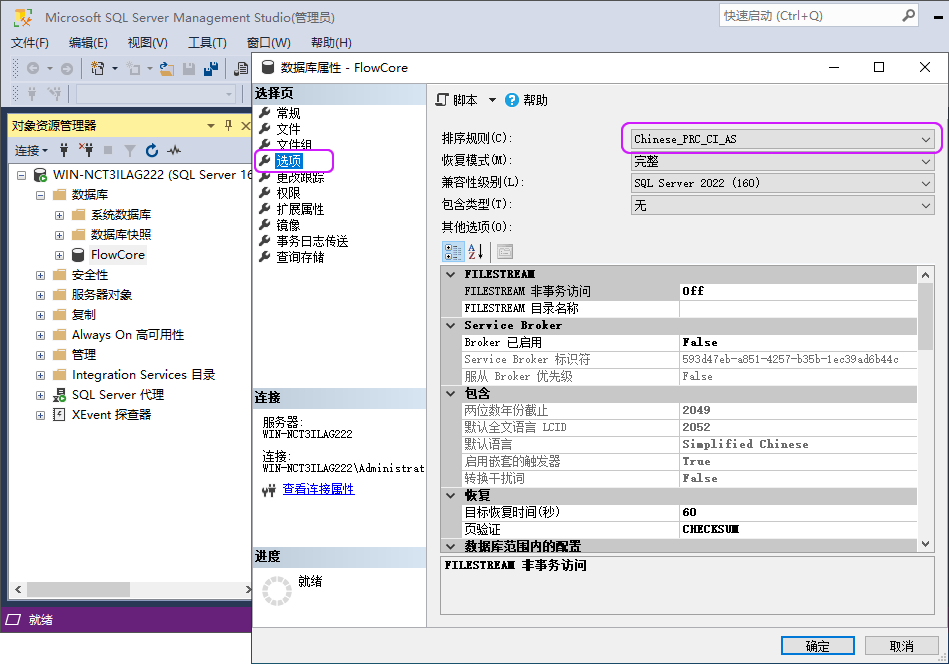 使用 SQL Server 管理器,选择数据库 > 属性 > 选项,确认数据库排序规则。ALTER DATABASE ExpressOA SET SINGLE_USER WITH ROLLBACK IMMEDIATE ALTER DATABASE ExpressOA COLLATE Chinese_PRC_CI_AS ALTER DATABASE ExpressOA SET MULTI_USER