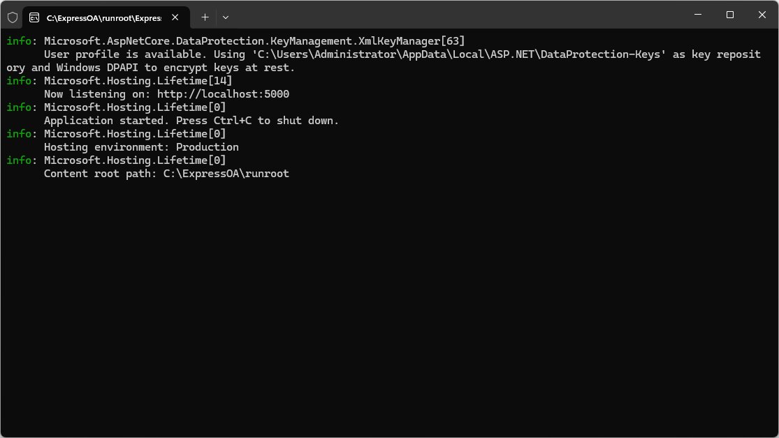 使用 Windows 命令行执行 runroot/ExpressOA.exe 启动控制台自托管。