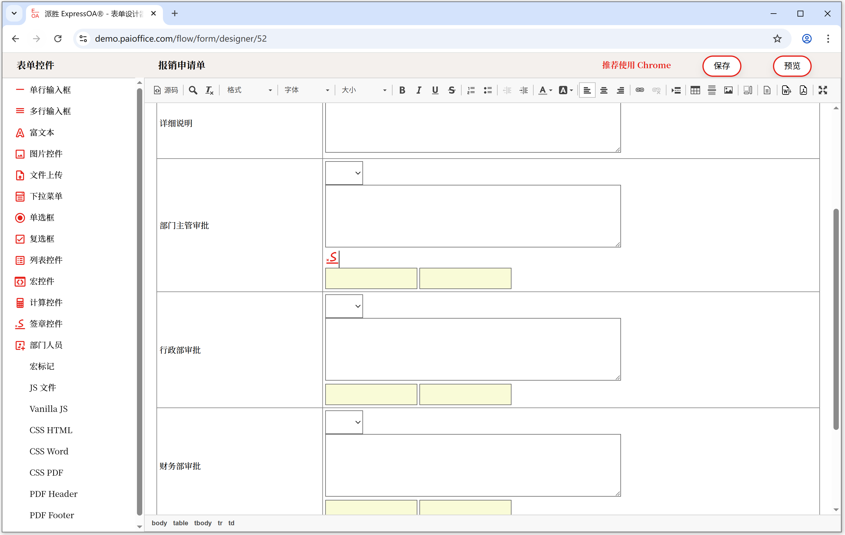 访问菜单:工作流(设置)→ <表单设计>,选择设计表单后在 <表单设计器> 内容区中添加 签章控件。