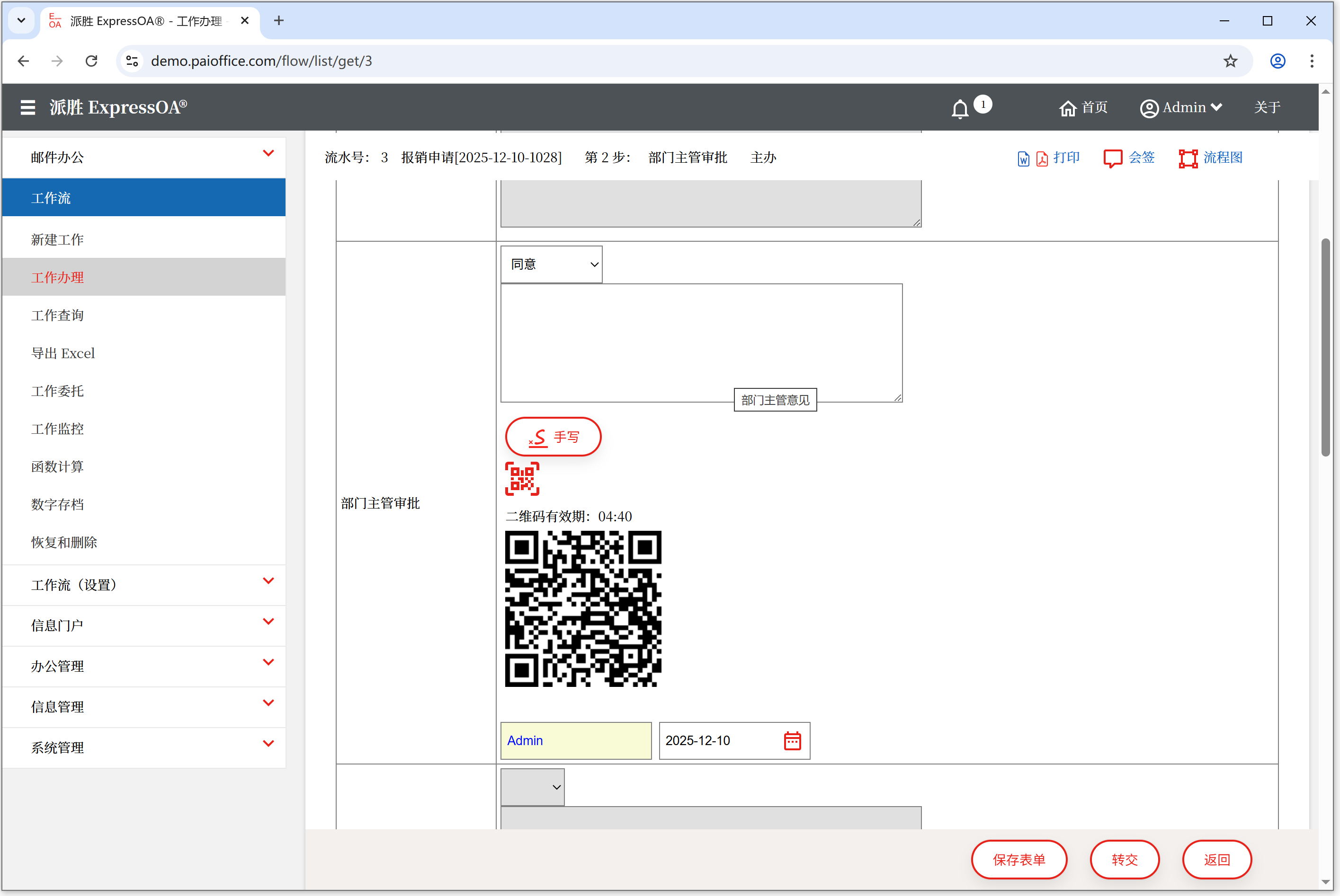 ,ExpressOA® 自动呈现二维码,使用手机扫码,在手机触摸屏幕中添加手写签名。