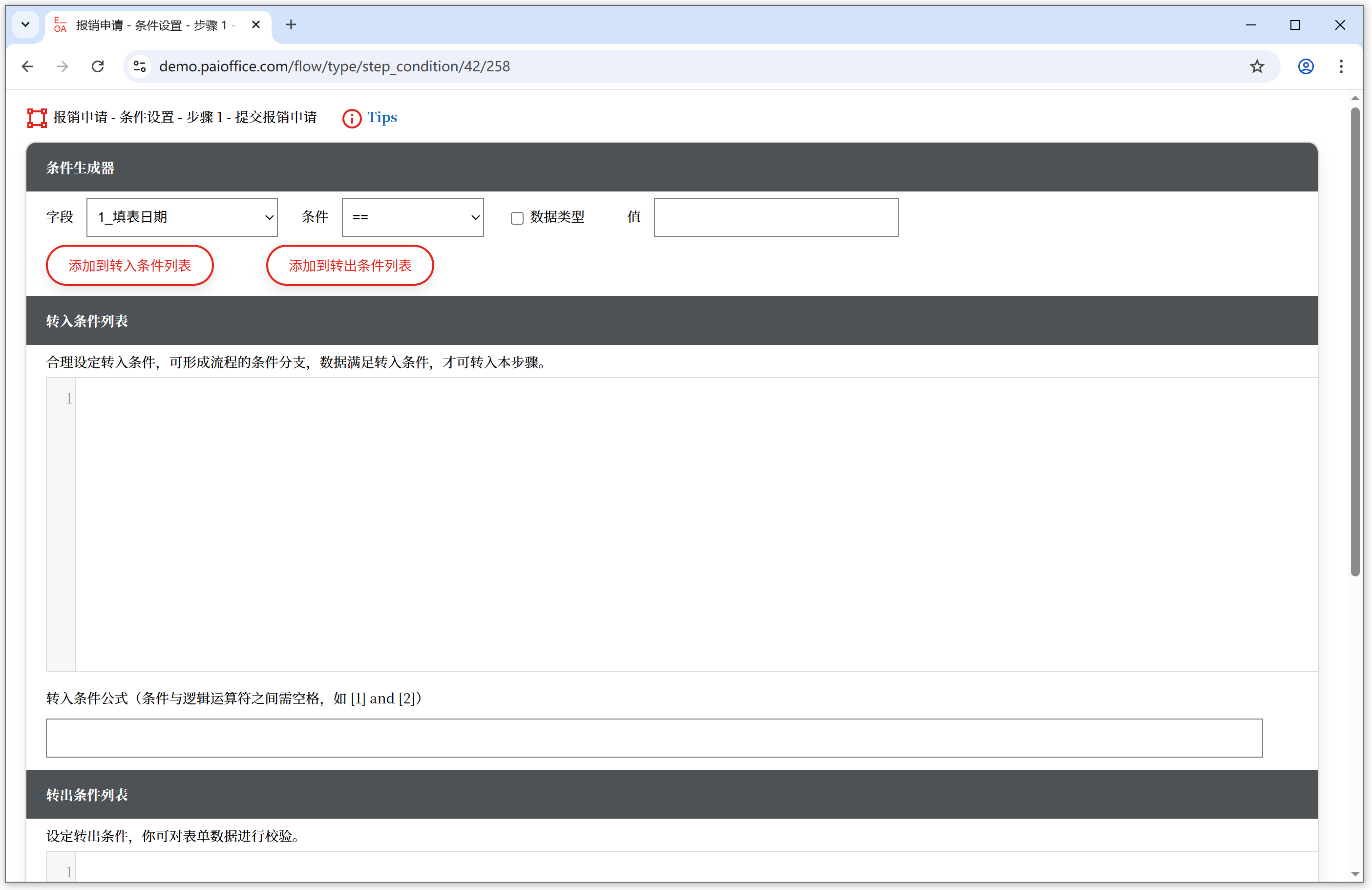 <条件设置> 对流程步骤设置转入和转出条件。
